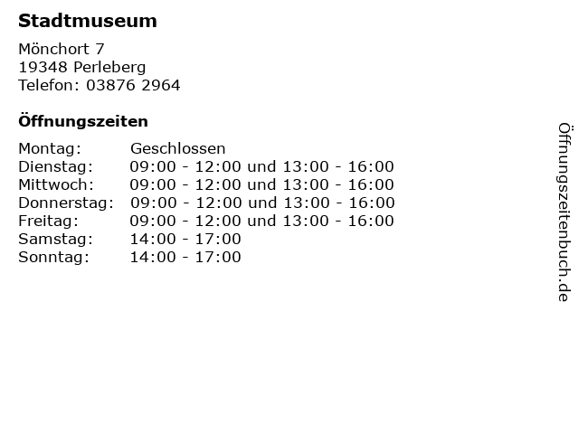 | Öffnungszeiten Stadtmuseum in Perleberg anzeigen | |