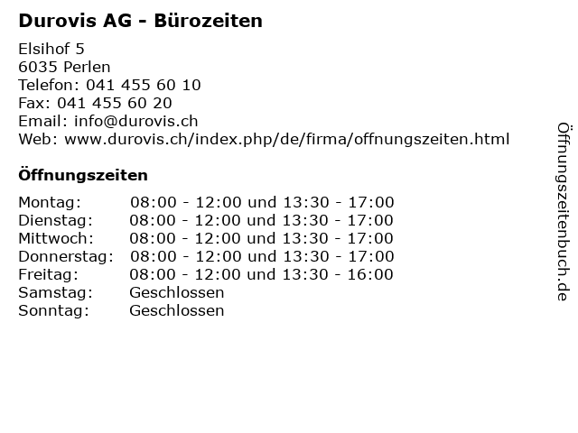 | Öffnungszeiten Durovis AG - Bürozeiten in Perlen anzeigen | |