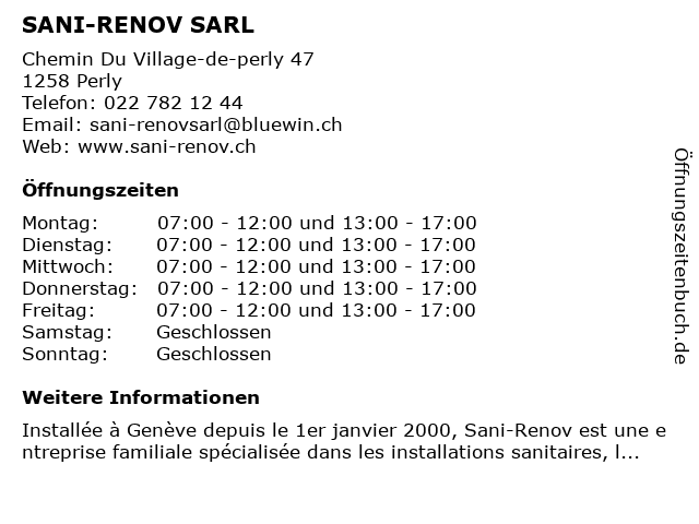 | Öffnungszeiten SANI-RENOV SARL in Perly anzeigen | |