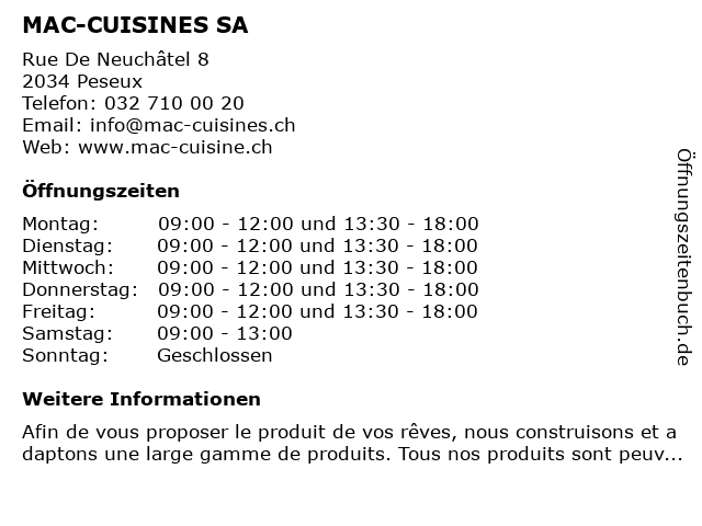| Öffnungszeiten MAC-CUISINES SA in Peseux anzeigen | |