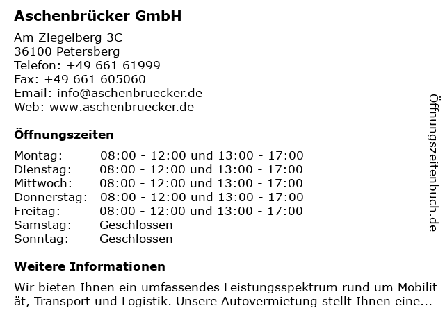 | Öffnungszeiten Aschenbrücker GmbH in Petersberg anzeigen | |