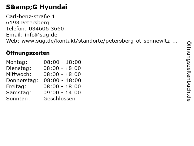 | Öffnungszeiten S&G Hyundai in Petersberg anzeigen | |