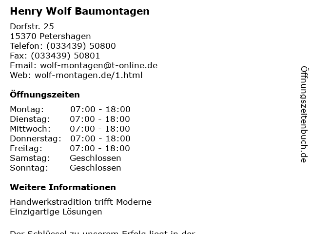 | Öffnungszeiten Henry Wolf Baumontagen in Petershagen anzeigen | |