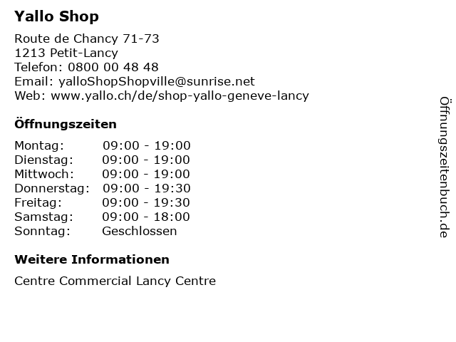 | Öffnungszeiten Yallo Shop in Petit-Lancy anzeigen | |