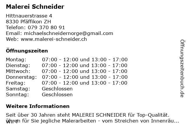 | Öffnungszeiten Malerei Schneider in Pfäffikon ZH anzeigen | |