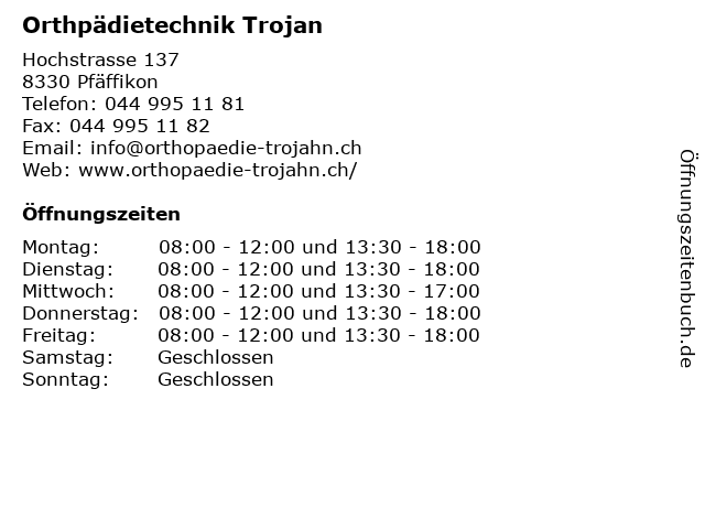 | Öffnungszeiten Orthpädietechnik Trojan in Pfäffikon anzeigen | |