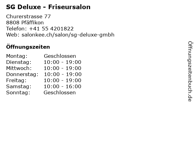 | Öffnungszeiten SG Deluxe - Friseursalon in Pfäffikon anzeigen | |