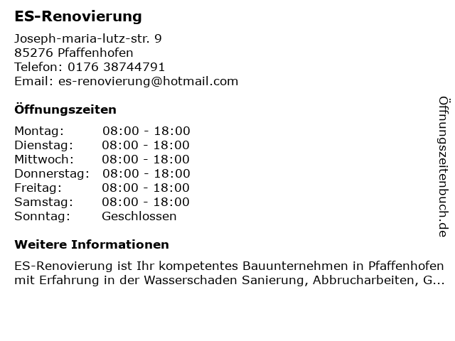 | Öffnungszeiten ES-Renovierung in Pfaffenhofen anzeigen | |
