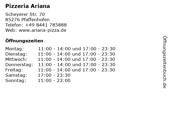 | Öffnungszeiten Pizzeria Ariana in Pfaffenhofen anzeigen | |