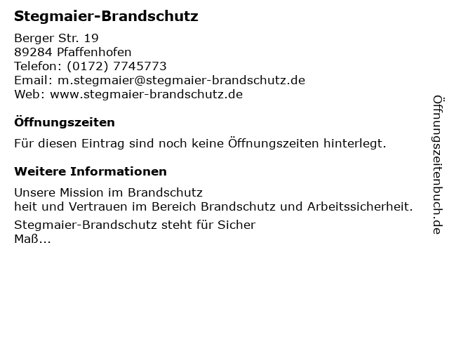 | Öffnungszeiten Stegmaier-Brandschutz in Pfaffenhofen anzeigen | |