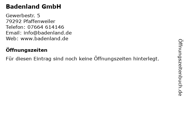 | Öffnungszeiten Badenland GmbH in Pfaffenweiler anzeigen | |