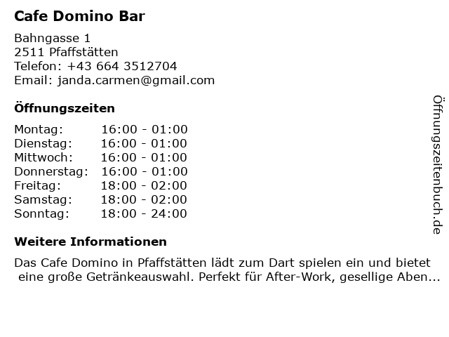 | Öffnungszeiten Cafe Domino Bar in Pfaffstätten anzeigen | |