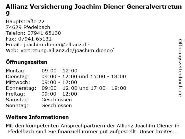 1 Allianz Vertretung Joachim Diener Versicherungsagentur (Entfernung: 0,01 km) Hauptstr. 22, 74629 Pfedelbach 3 Allianz Versicherung Jürgen Brümmer Hauptvertretung (Entfernung: 4,89 km) Adolzfurter Straße 60, 74626 Bretzfeld 5 AXA Versicherung - Hauptvertretung Benedikt Hauck (Entfernung: 5,02 km) Heimbachstr. 26, 74626 Bretzfeld-Unterheimbach 6 Allianz Versicherung Maximilian Wald Hauptvertretung (Entfernung: 11,70 km) Marktstraße 2, 74182 Obersulm |