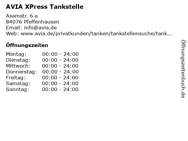 | Öffnungszeiten AVIA XPress Tankstelle in Pfeffenhausen anzeigen | |