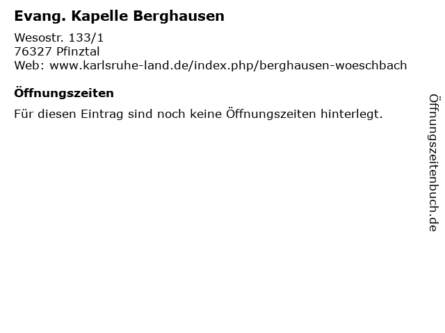 | Öffnungszeiten Evang. Kapelle Berghausen in Pfinztal anzeigen | |