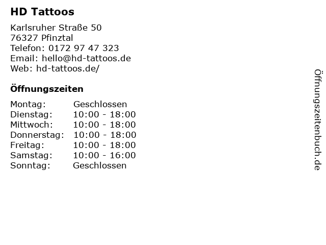 | Öffnungszeiten HD Tattoos in Pfinztal anzeigen | |