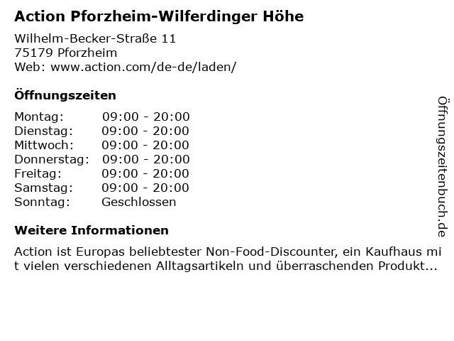 | Öffnungszeiten Action Pforzheim-Wilferdinger Höhe in Pforzheim anzeigen | |