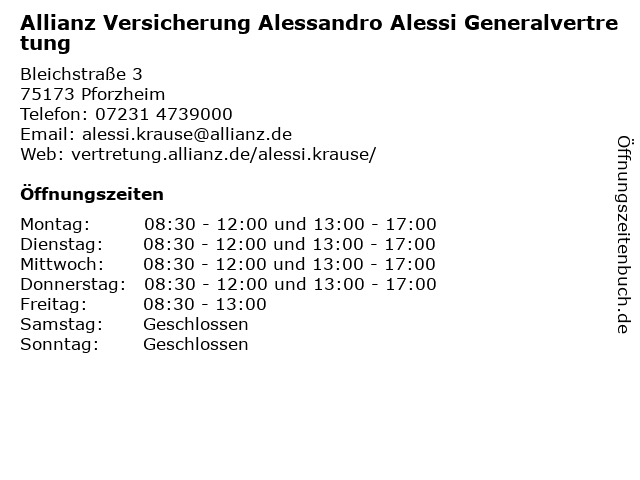 1 Allianz Versicherung Santos Andrino und Alessi OHG Agentur (Entfernung: 0,01 km) Bleichstraße 3 a, 75173 Pforzheim 3 Versicherung Hubert Seeger OHG Generalvertretung (Entfernung: 3,37 km) Wohnlichstraße , 75179 Pforzheim 4 Allianz Versicherung Hubert Seeger OHG Generalvertretung (Entfernung: 3,38 km) Wohnlichstraße 6-8, 75179 Pforzheim 6 |
