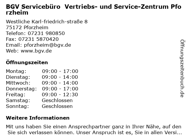 Branchen & Suchbegriffe zu BGV Servicebüro Vertriebs- und Service-Zentrum Pforzheim:bgv, gebäude- und hausratsversicherung, kfz-versicherung (motorrad), lebensversicherung, service, servicebüro, vertriebs, zahnmedizinische versicherung, zentrum |