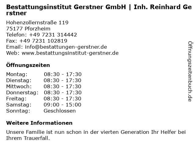 1 Bestattungsinstitut Reinhard Gerstner GmbH (Entfernung: 0,01 km) Hohenzollernstr. 119, 75177 Pforzheim 6 |