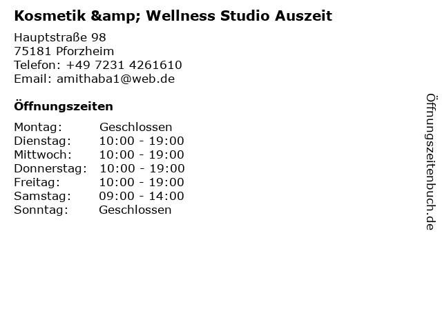1 Samsel Emil Inh. Rolf Samsel Schmuck, Wellness und Gesundheit Schmuckfabrikation (Entfernung: 3,14 km) Leopoldstr. 21, 75223 Niefern-Öschelbronn 3 Hubers Cateringservice und Cafe - Bistro kleine Auszeit (Entfernung: 8,23 km) Untere Eisinger Straße 2, 75236 Kämpfelbach 4 Formostar-Therapie - Caterina Konrad Wellness (Entfernung: 8,23 km) Lange Straße 34, 75236 Kämpfelbach 5 Zoe und Panagiotis Bonidis Therapie- und Wellness-Studio (Entfernung: 11,00 km) Westliche Friedrichstr. 72, 75210 Keltern 6 Wellness- Beauty Institut Elisabeth Schäfer Kosmetikstudio (Entfernung: 12,89 km) Breslauer Str. 3, 75196 Remchingen |
