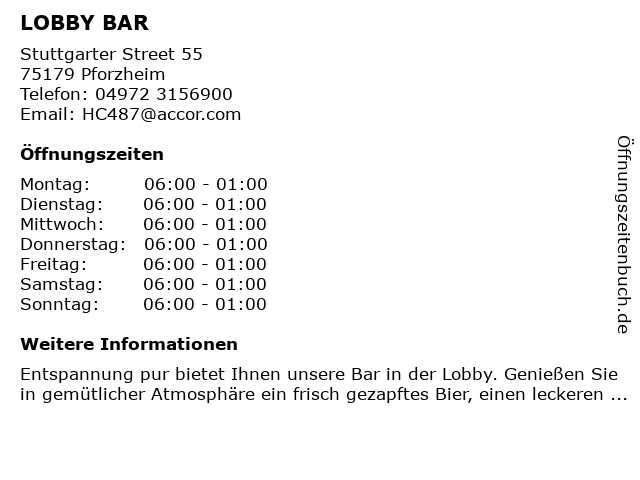 | Öffnungszeiten LOBBY BAR in Pforzheim anzeigen | |