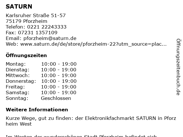 Im Westen der wunderschönen Stadt Pforzheim befindet sich der Elektronikfachhandel SATURN direkt an der Karlsruher Straße.