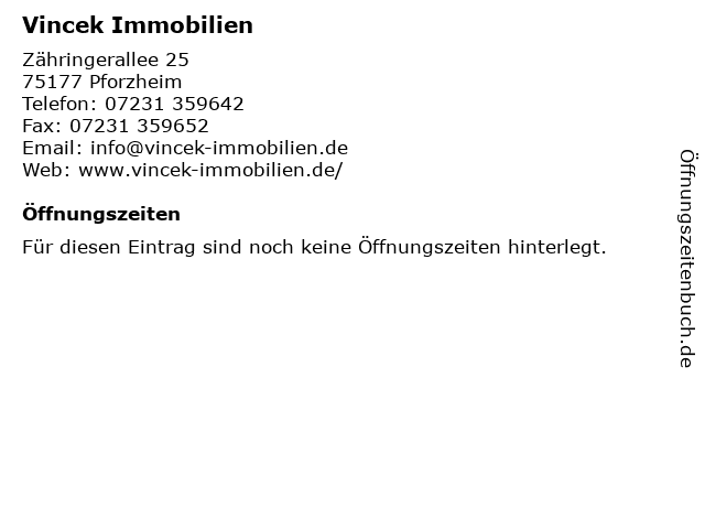 | Öffnungszeiten Vincek Immobilien in Pforzheim anzeigen | |