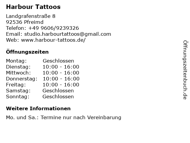 | Öffnungszeiten Harbour Tattoos in Pfreimd anzeigen | |