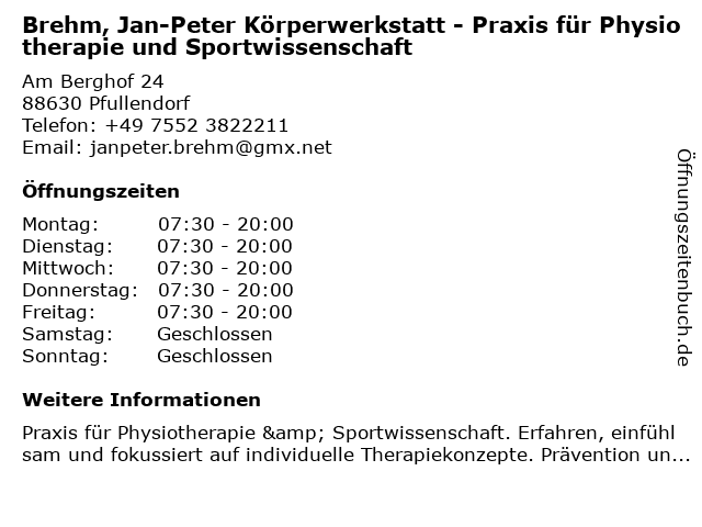 Branchen & Suchbegriffe zu Brehm, Jan-Peter Körperwerkstatt - Praxis für Physiotherapie und Sportwissenschaft:bewegungskoordinationstraining, bewegungstherapie, brehm, fango, jan, knieprobleme, krankengymnastik, körperwerkstatt, lymphdrainage, manuelle therapie, muskel- und gelenktherapie, muskeltherapie, peter, physiotherapie, physiotherapie praxis, praxis, rehabilitation physiotherapie, rückenschmerzen, schulterschmerzen, sportphysiotherapie, sportwissenschaft, therapeutische behandlung |