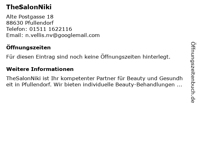 | Öffnungszeiten TheSalonNiki in Pfullendorf anzeigen | |
