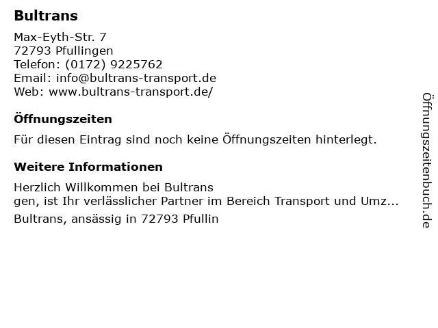 | Öffnungszeiten Bultrans in Pfullingen anzeigen | |