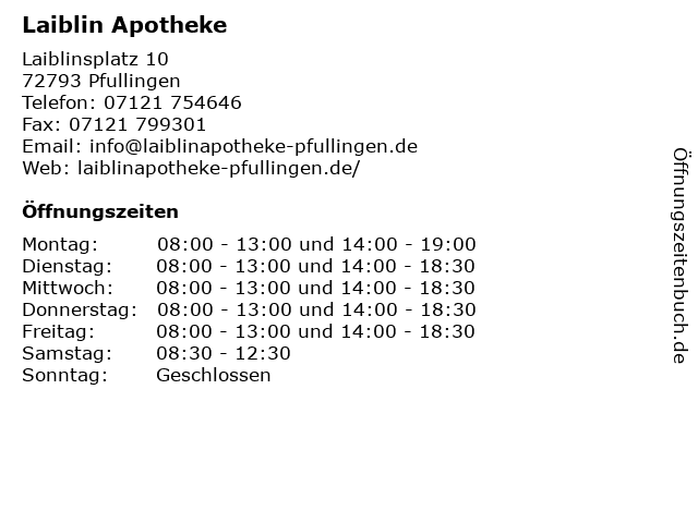 | Öffnungszeiten Laiblin Apotheke in Pfullingen anzeigen | |