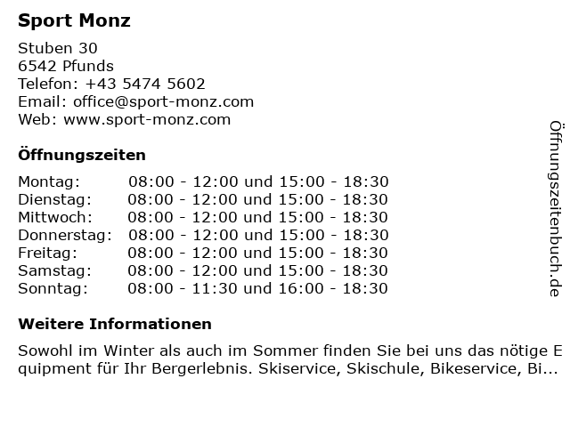 | Öffnungszeiten Sport Monz in Pfunds anzeigen | |