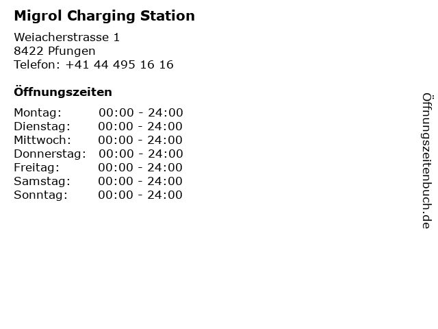 | Öffnungszeiten Migrol Charging Station in Pfungen anzeigen | |