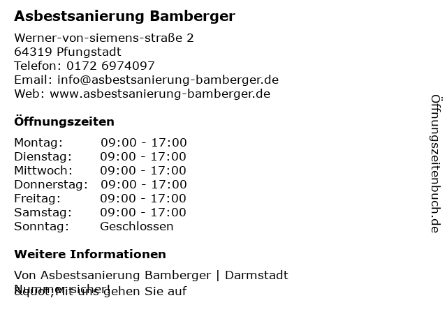 | Öffnungszeiten Asbestsanierung Bamberger in Pfungstadt anzeigen | |