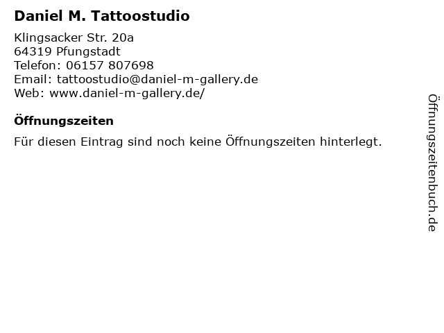 | Öffnungszeiten Daniel M. Tattoostudio in Pfungstadt anzeigen | |