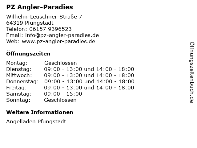 | Öffnungszeiten PZ Angler-Paradies in Pfungstadt anzeigen | |