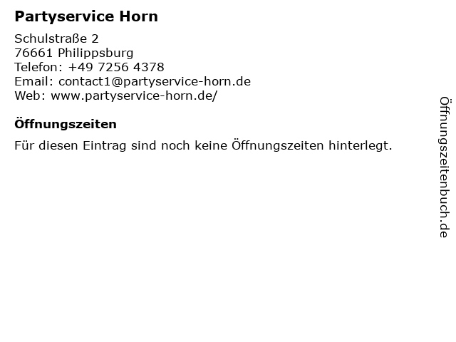 | Öffnungszeiten Partyservice Horn in Philippsburg anzeigen | |
