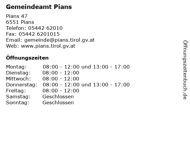 | Öffnungszeiten Gemeindeamt Pians in Pians anzeigen | |