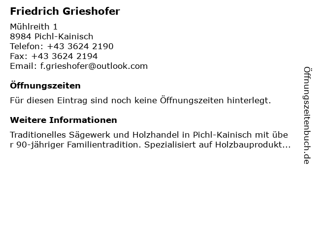| Öffnungszeiten Friedrich Grieshofer in Pichl-Kainisch anzeigen | |