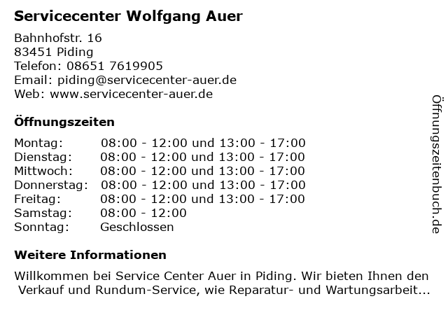| Öffnungszeiten Servicecenter Wolfgang Auer in Piding anzeigen | |