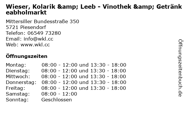 1 Wieser, Kolarik & Leeb - Großhandel (Entfernung: 0,00 km) Mittersiller Bundesstraße 350, 5721 Piesendorf 4 Wieser + Scherer Zeller Haustechnik GmbH & Co KG (Entfernung: 5,38 km) Prof. Ferry Porsche Straße 11, 5700 Zell am See 6 |