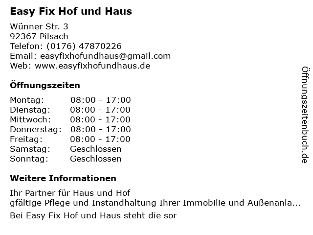 | Öffnungszeiten Easy Fix Hof und Haus in Pilsach anzeigen | |