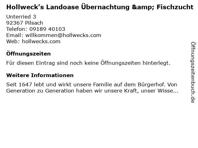 Öffnungszeiten Hollweck’s Landoase Übernachtung & Fischzucht