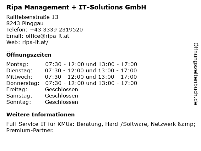 Branchen & Suchbegriffe zu Ripa Management + IT-Solutions GmbH:backup solutions, cloud solutions, computer reparatur, computer service, datensicherung, edv support, fernwartung, it, it betreuung, it notdienst, it sicherheit, it wartung, it-consulting, it-support, management, netzwerk, onsite it-support, pc hilfe, pc langsam, remote support, ripa, software, solutions, vor-ort-service |