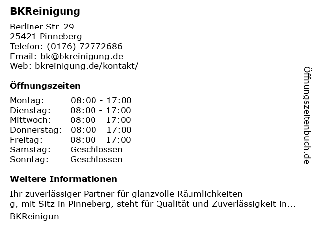 | Öffnungszeiten BKReinigung in Pinneberg anzeigen | |