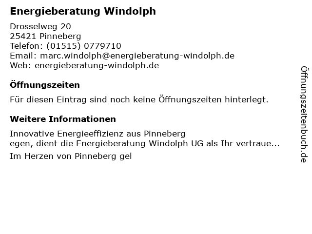 | Öffnungszeiten Energieberatung Windolph in Pinneberg anzeigen | |