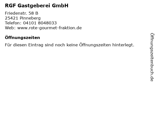 | Öffnungszeiten RGF Gastgeberei GmbH in Pinneberg anzeigen | |