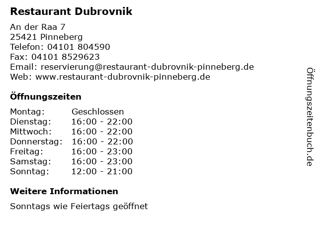 | Öffnungszeiten Restaurant Dubrovnik in Pinneberg anzeigen | |